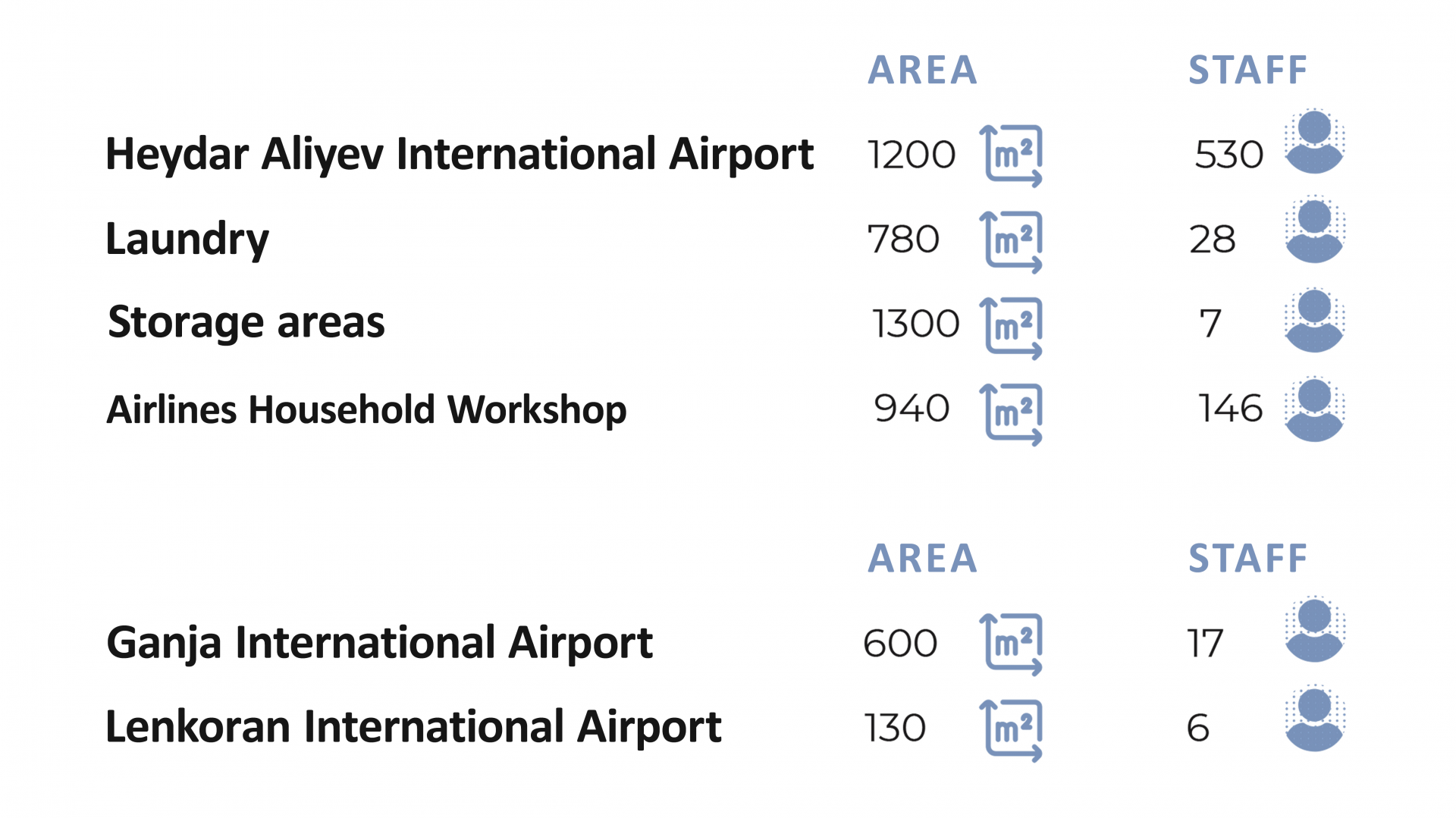 The in-flight catering unit in Heydar Aliyev International Airport (Territory is 6 800 square meter production area + 1 200 square meter office area, 530 staff members) Sky Catering owned in-flight catering unit in Ganca International Airport (Territory is 600 square meter and 17 staff members), in flight catering unit in Lenkaran International Airport (Territory is 130 square meter and 6 staff members), laundry (Territory is 780 square meter and 28 staff members), storage areas (Territory is 1300 square meter and 7 staff members), Airlines Household Workshop (Territory is 940 square meter and 146 staff members). Car park of Sky Catering consist 29 cars and trucks. 11 of them is special aircraft serving trucks (Hi-Loader), 18 of them is regular trucks.